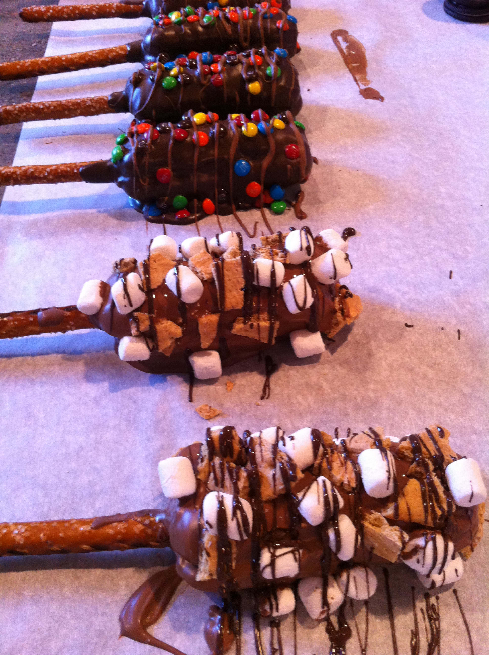 S’mores- Devil Dogs ® with a pretzel rod enrobed in Milk chocolate and topped with marshmallows and graham cracker pieces.